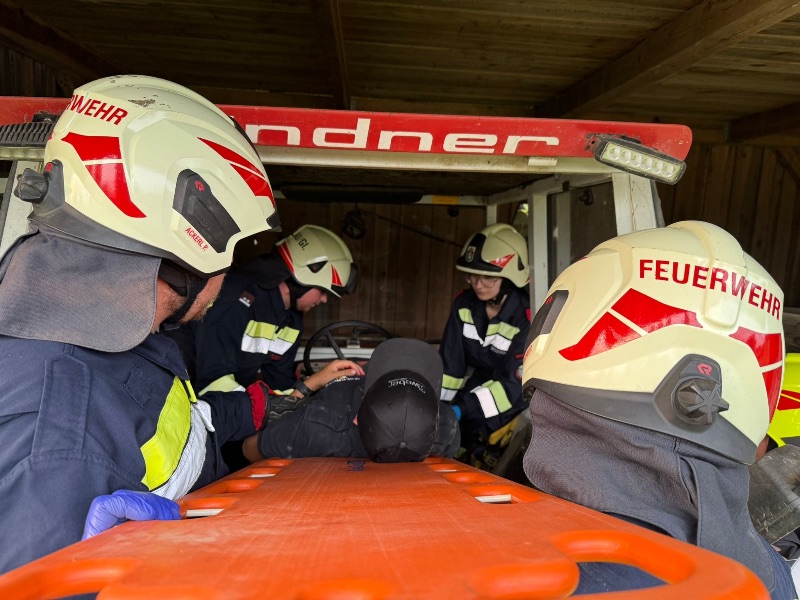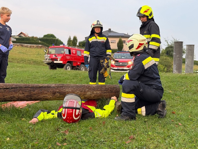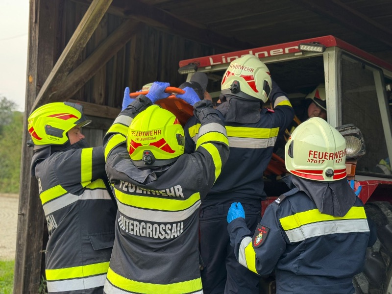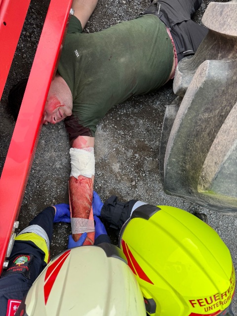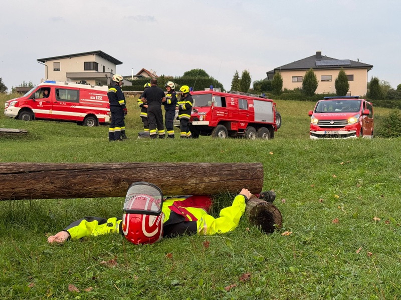 Bei der letzten Station waren erneut zwei Personen beteiligt. Eine wurde bei Forstarbeiten unter einem Baumstamm eingeklemmt. Die zweite Person erlitt eine schwere Fußverletzung und musste mit dem Spineboard schonend aus einem Traktor gerettet werden.