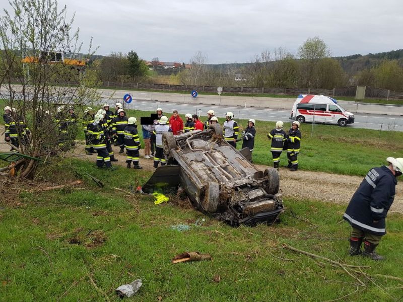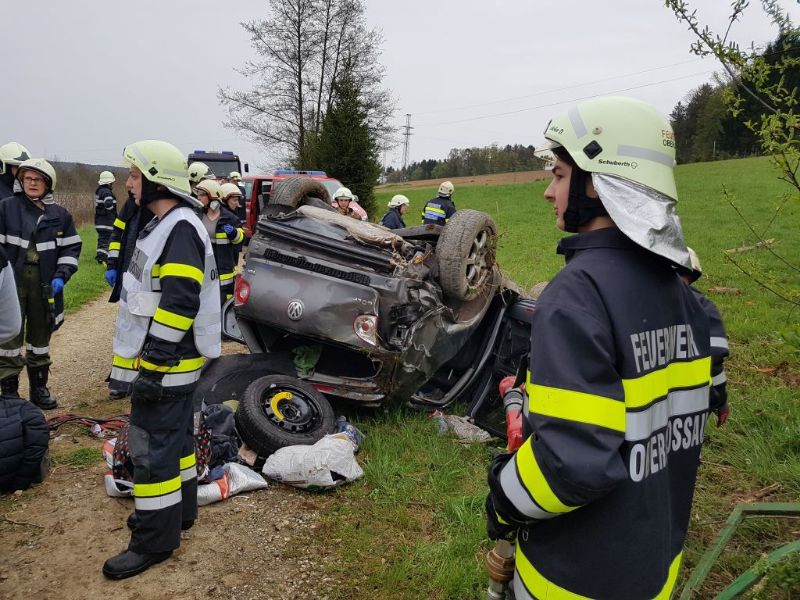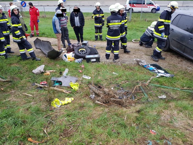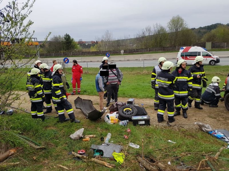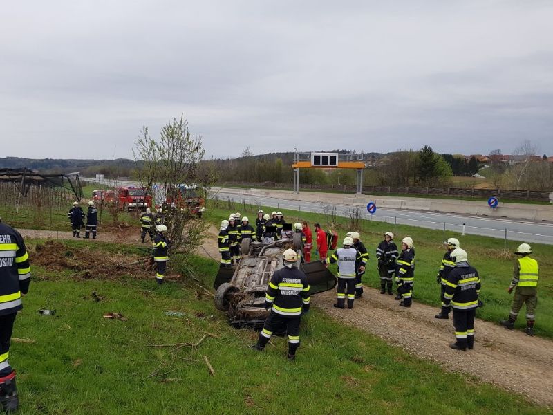Die Insassen konnten sich selbst aus dem Fahrzeug befreien und gaben bei unserer Ankunft bekannt, dass der Fahrer weggelaufen wäre. Daraufhin fuhren wir mit unserem KLF-A das Waldstück in die nähere Umgebung ab. Es stellte sich aber heraus, dass die Angaben nicht richtig waren.
