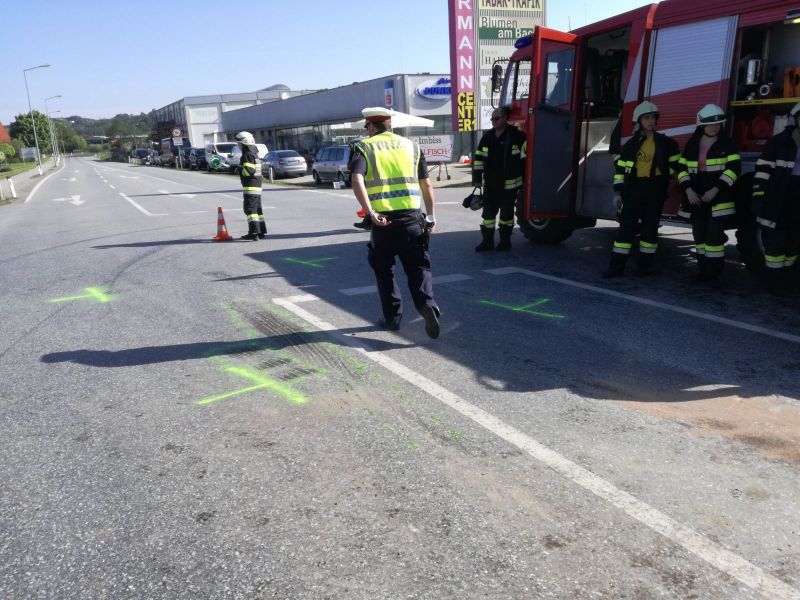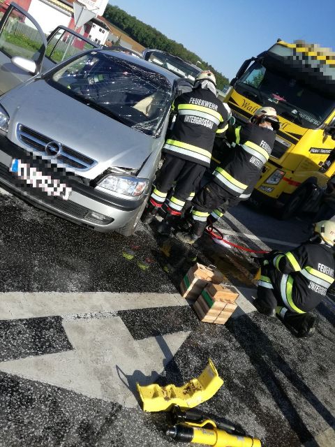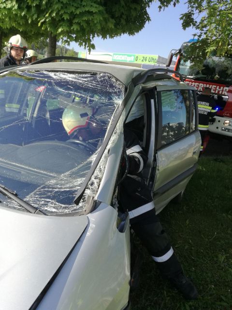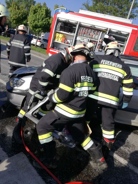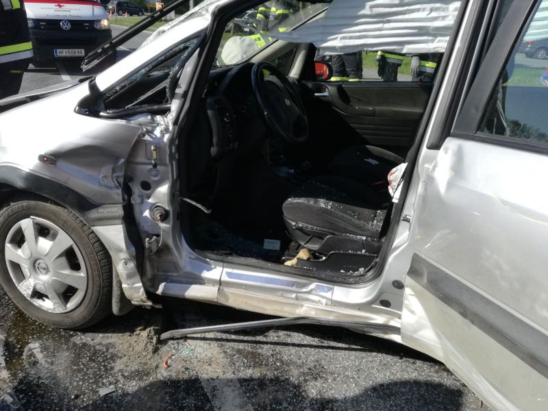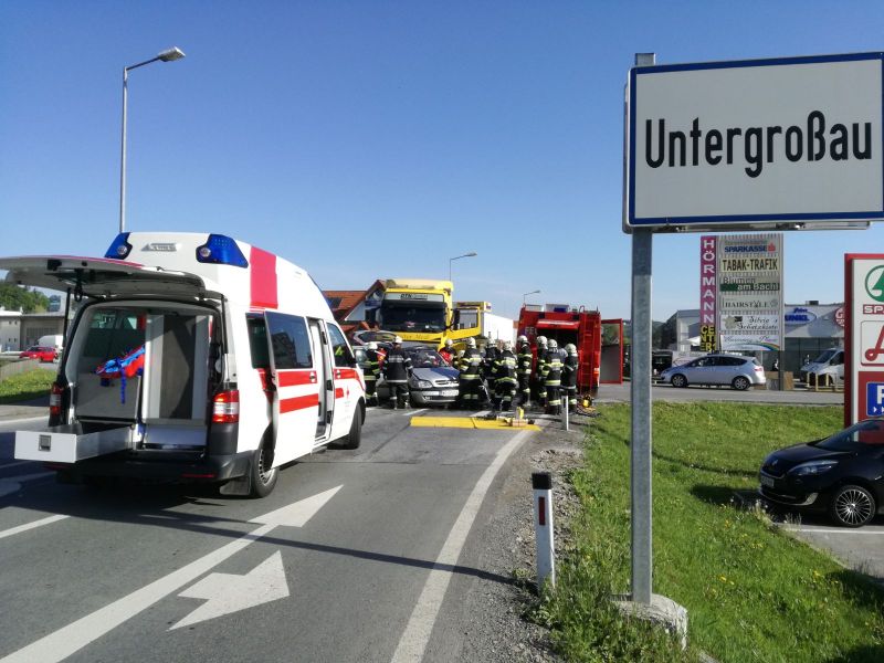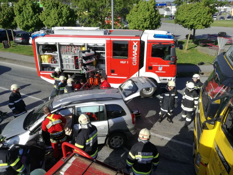 Aus ungeklärter Ursache kollidierte ein PKW und ein LKW im Kreuzungsbereich vom Hörmanncenter und der Tankstelle! Durch die wucht des Aufprall's deformierte sich die Fahrerseite des PKW's so stark das der PKW Lenker im Fahrzeug eingeklemmt war.