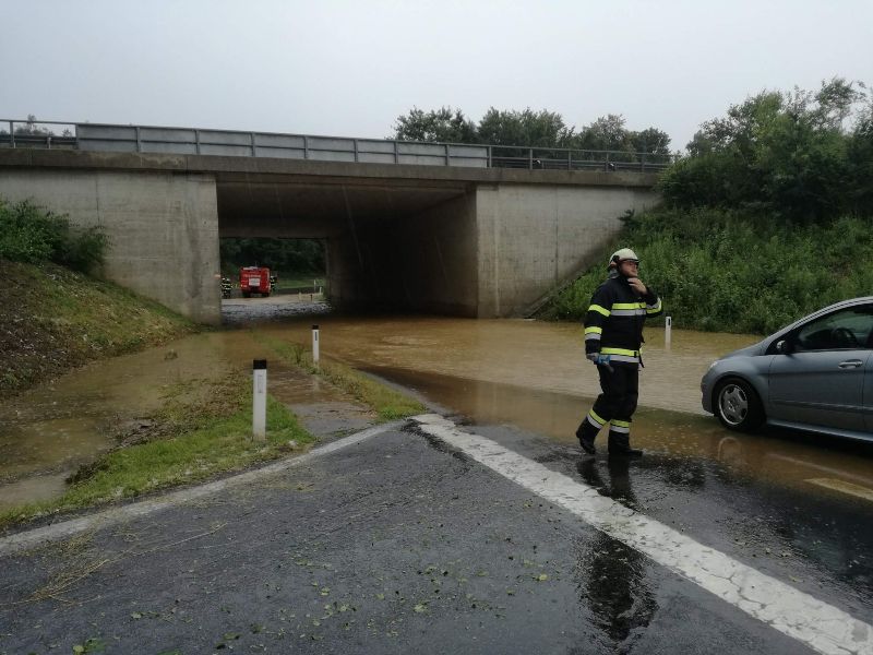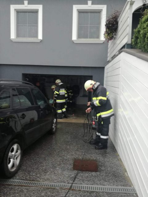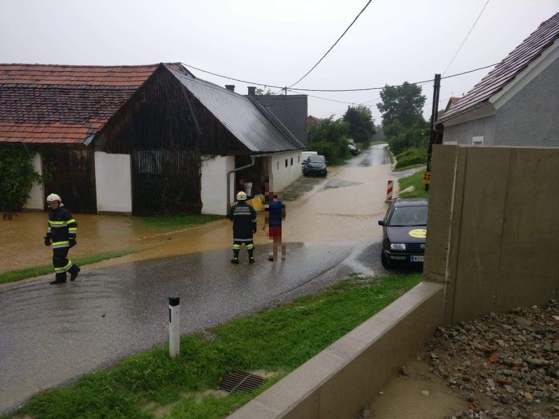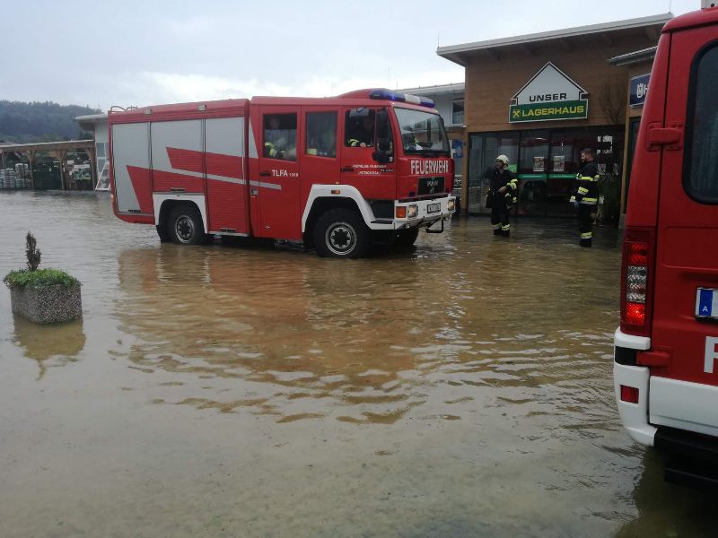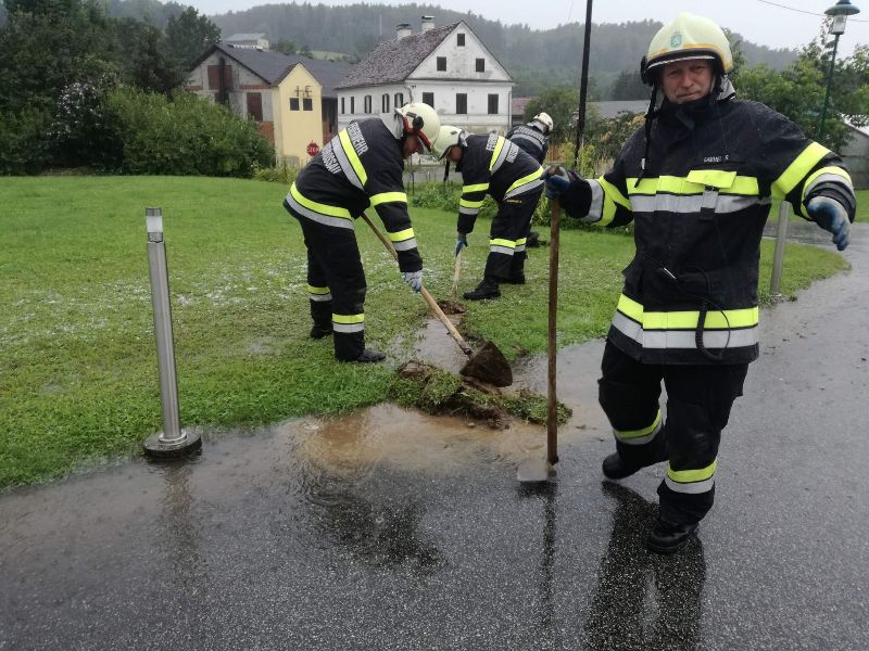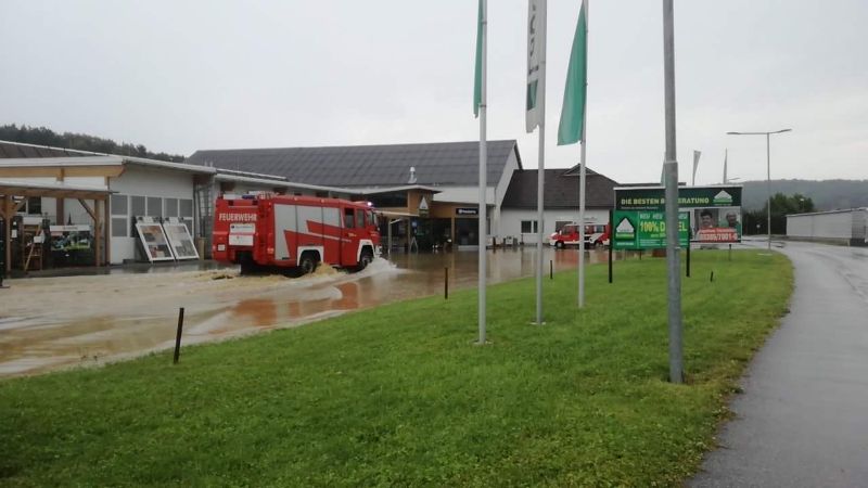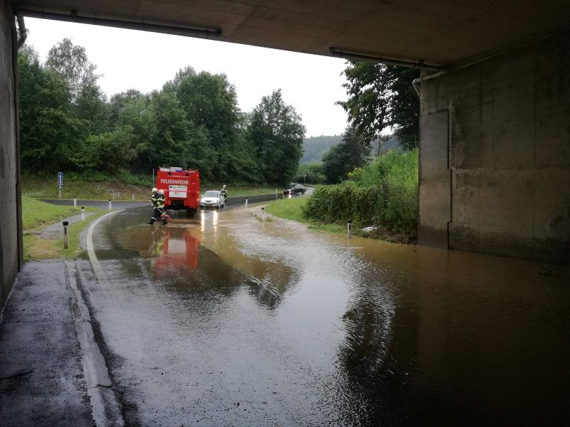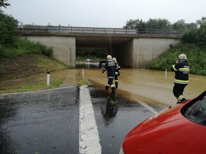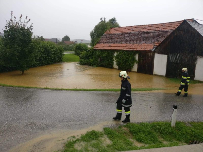 Durch ein schweres Gewitter mit Niederschläge bis zu 40 Liter in einer halben Stunde wurden mehrere Straßen überflutet. In zwei Häuser tritt auch Wasser im Bereich des Keller ein.